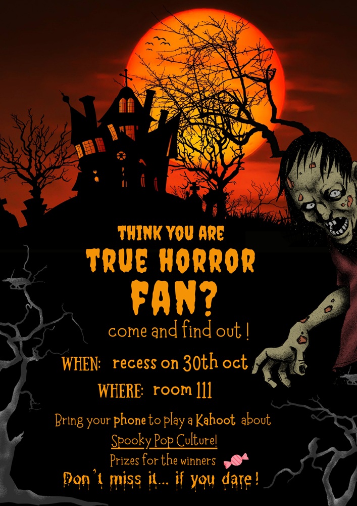 Allí celebraremos un Kahoot especial sobre Spooky Pop Culture, con preguntas escalofriantemente divertidas sobre películas, series, música y misterios.