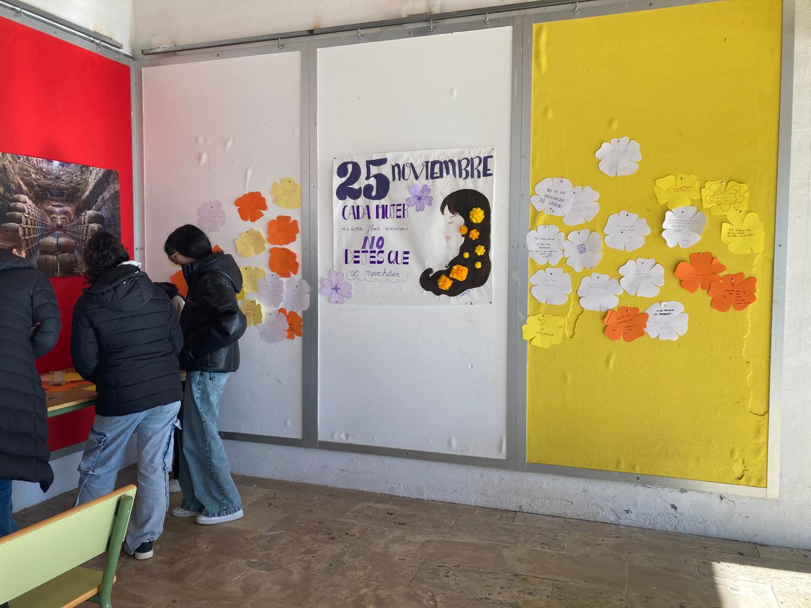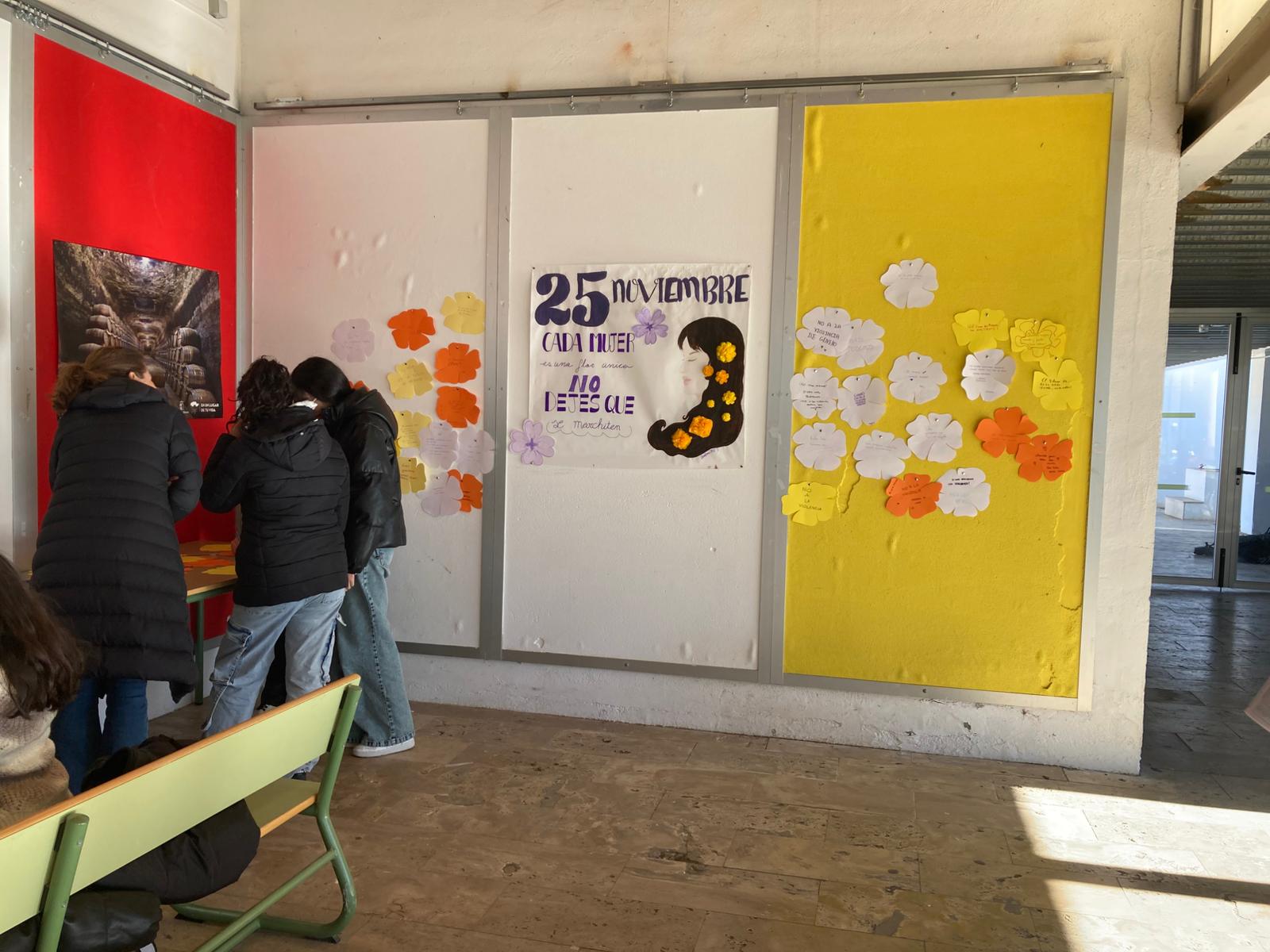 Además, alumnos y profesores han participado en una actividad colocando flores con mensajes y frases contra la violencia de género, un gesto simbólico que ha llenado el espacio de color y reflexión.