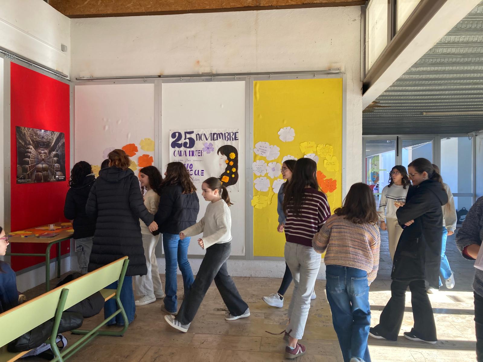 Durante el recreo, se ha colocado en el patio un cartel conmemorativo elaborado por la alumna Carolina Mercado, de 4º de ESO. Carolina no solo ha diseñado el cartel, sino que ha demostrado una gran creatividad y una enorme disponibilidad para confeccionarlo, implicándose de manera ejemplar en esta iniciativa. En el proceso de pintado ha contado con la colaboración de las alumnas Oumaima, Kelianne, Daniela y Melany, quienes han contribuido a dar forma a esta obra colectiva que simboliza el compromiso del centro con esta causa.