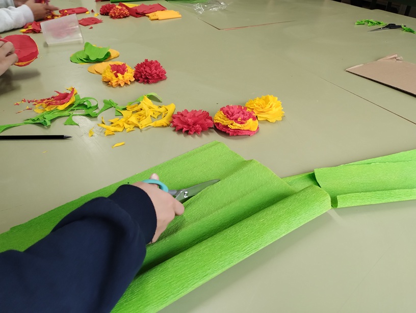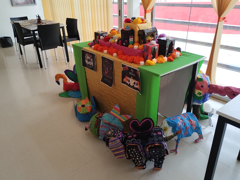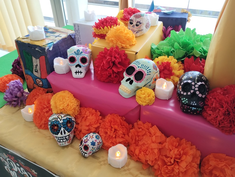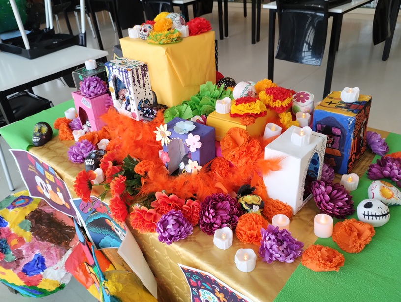 El alumnado de 1º, 2º y 4º de la ESO ha realizado un proyecto colaborativo dedicado al “Día de Muertos”, “Halloween” y “Día de Todos los Santos”, una celebración multicultural que une memoria y arte. Los estudiantes han explorado su creatividad a través del modelado y pintado de calaveras, la creación de flores decorativas de papel y la construcción de alebrijes con materiales reciclados. El resultado es una mezcla de artesanía, color, imaginación y fantasía. El proyecto se ha presentado mediante una exposición en la biblioteca del centro, en la que además se han propuesto diferentes lecturas terroríficas y escalofriantes relacionadas con la festividad.