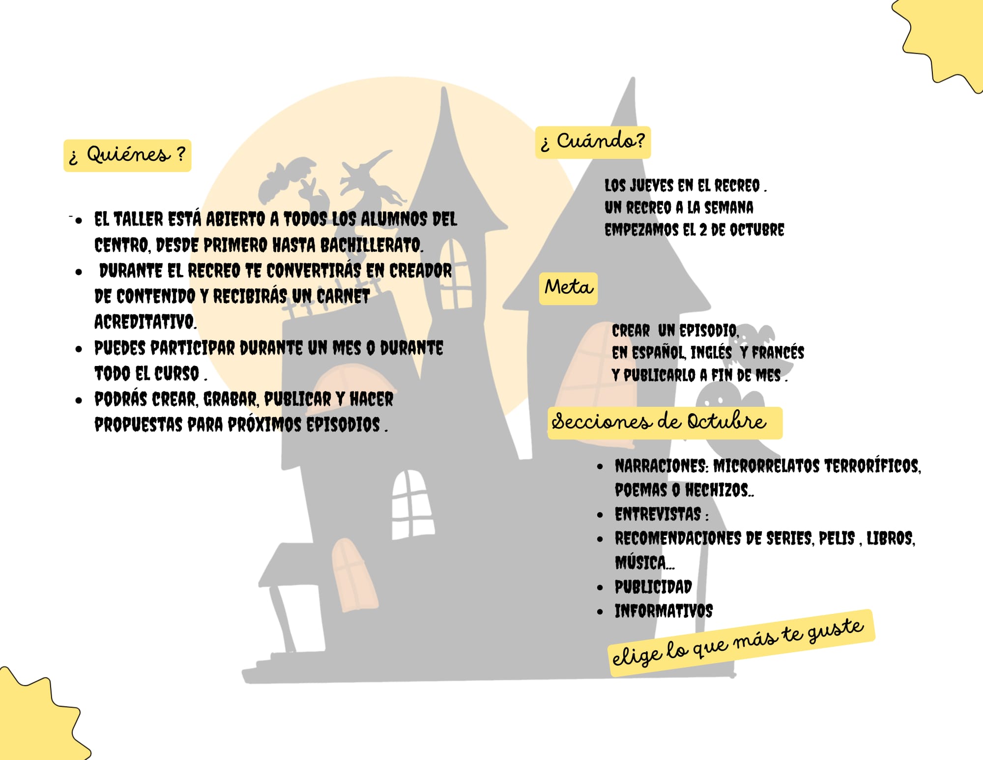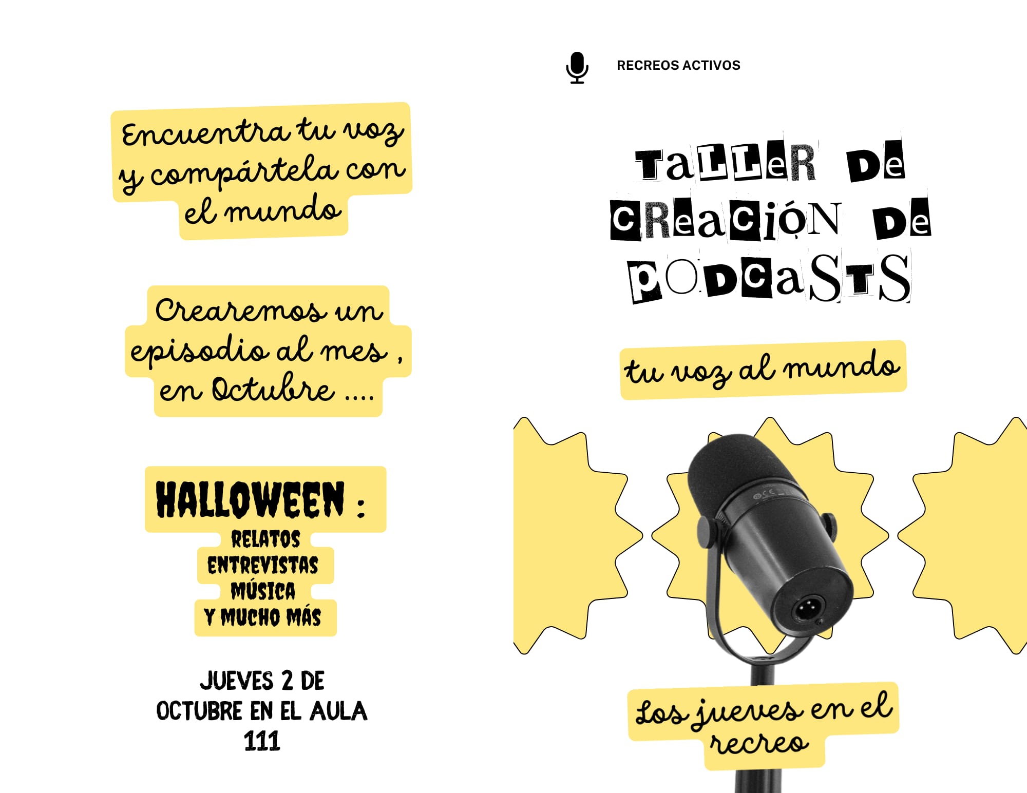 Si quieres participar en un proyecto creativo, ven al aula 112 el jueves durante el recreo. Una vez por semana dedicaremos el recreo a crear un podcast que publicaremos a finales de cada mes. El taller está abierto a todos los alumnos, desde 1° ESO hasta bachillerato.